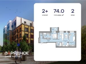Продается 2-комнатная квартира, корпус 2, площадь 74.00 кв. с предчистовой отделкой. Квартира находится в жилом комплексе комфорт-класса "Зарядное" (ГК "Железно").