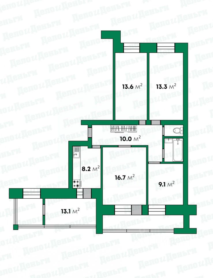 - Комнаты площадью 16,7м², 13,6м², 13,3м², 9,1м².