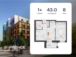 Продается 1-комнатная квартира, корпус 4/2, площадь 43.00 кв. Квартира находится в жилом комплексе комфорт-класса "Зарядное" (ГК "Железно").