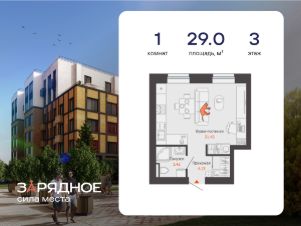 Продается студия, корпус 4/2, площадь 29.00 кв. Квартира находится в жилом комплексе комфорт-класса "Зарядное" (ГК "Железно").