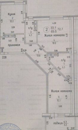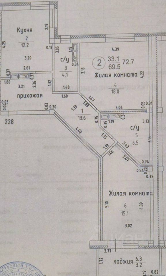 Общая площадь квартиры 69,5 м² + лоджия с панорамным остеклением 6,4 м².