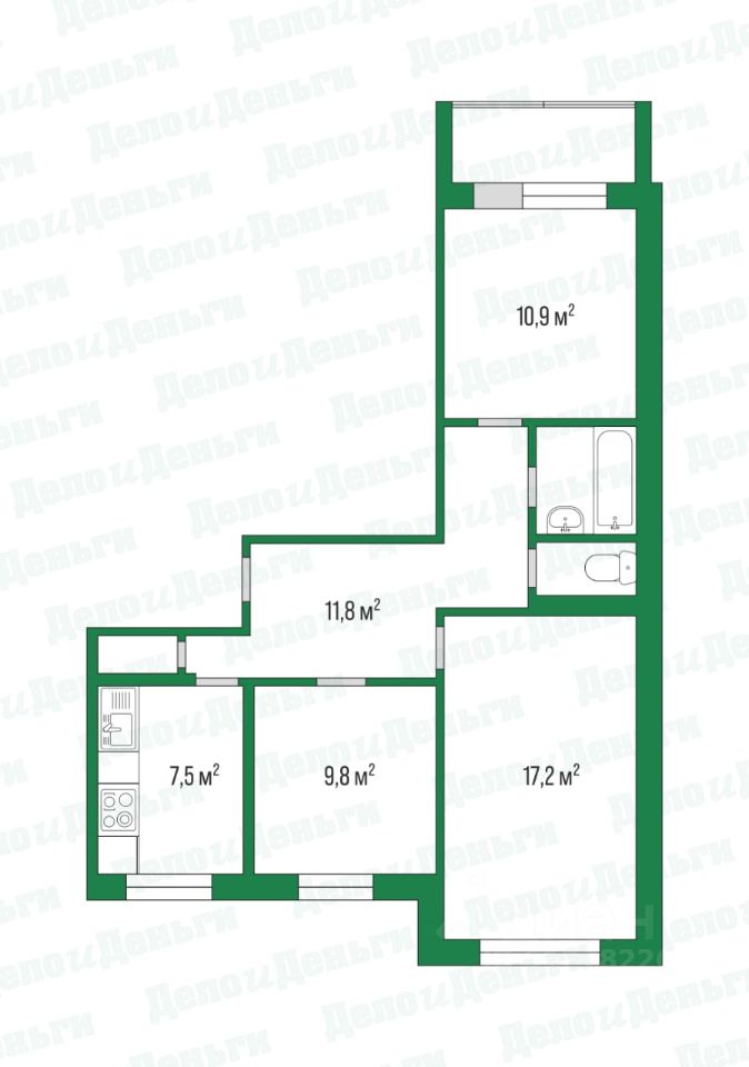 три отдельные комнаты (17,2 м², 10,9 м², 9,8 м²) — родителям и детям по своему пространству