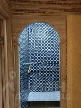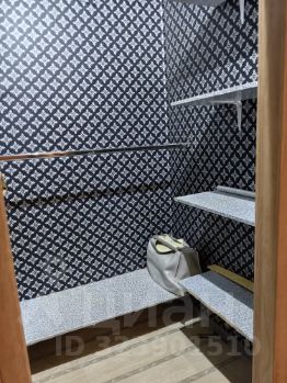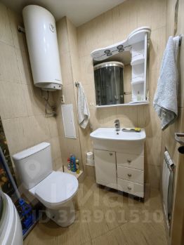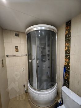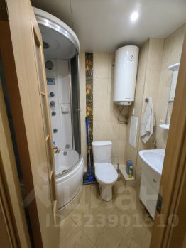 Стильная плитка, душевая кабина, водонагреватель, современная сантехника, зеркало, шкафчики.