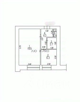 КВАДРАТУРА: комната 19,6 кв.м., кухня 6,3 кв.м., совмещенный санузел 2,7 кв.м., коридор и прихожая со встроенными шкафами 4,8 кв.м., балкона нет.