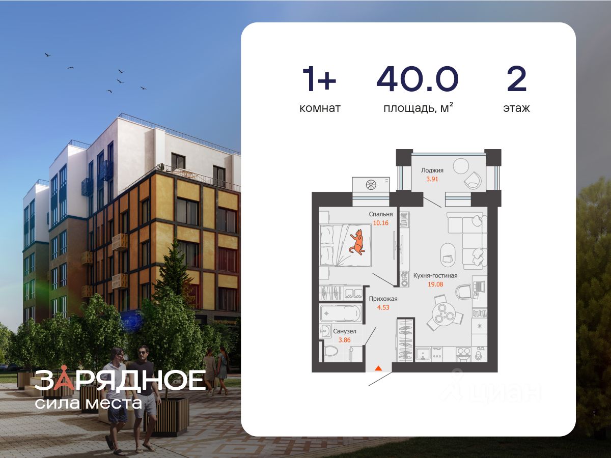Продается 1-комнатная квартира, корпус 4/1, площадь 40.00 кв. Квартира находится в жилом комплексе комфорт-класса "Зарядное" (ГК "Железно").