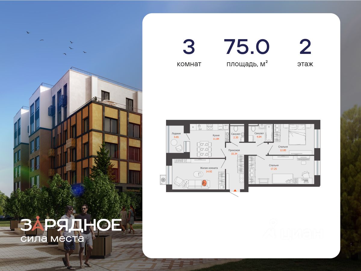 Продается 3-комнатная квартира, корпус 4/1, площадь 75.00 кв. Квартира находится в жилом комплексе комфорт-класса "Зарядное" (ГК "Железно").