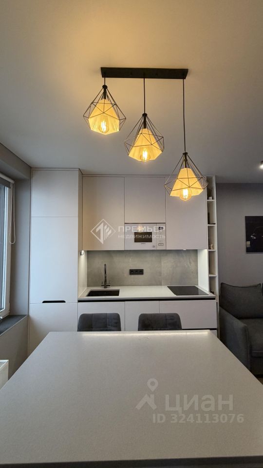 Двери в квартире - скрытые, от салона "Порта-Нова". Кухня изготовлена на заказ в салоне "Диван Комодофф": фасады из МДФ, дверцы на доводчиках, без ручек, столешницы из искусственного камня. В кухне встроена техника: двухкамерный инверторный холодильник, индукционная варочная панель Weisgauff, посудомоечная машина Maunfield, система фильтрации воды Electrolux. Есть остров с системой хранения и розеткой.