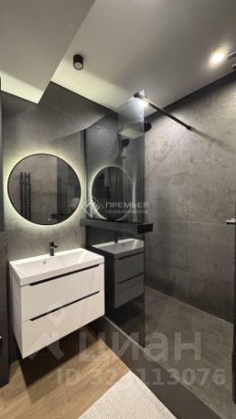 Санузел выложен полноформатным керамогранитом Kerama Marazzi. Сантехника - AM-PM (Германия), душевая перегородка - из закалённого тонированного стекла с полкой, сливной трап - Alkaplast. Для приборов учёта сделаны скрытые люки.