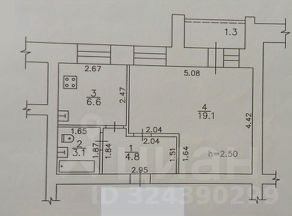 Планировка квартиры: кухня - 6,6 м2, комната - 19,1 м2, прихожая - 4,8 м2, санузел - 3,1 м2.