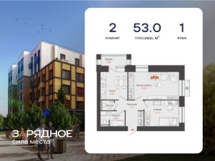 Продается 2-комнатная квартира, корпус 4/1, площадь 53.00 кв. с предчистовой отделкой. Квартира находится в жилом комплексе комфорт-класса "Зарядное" (ГК "Железно").