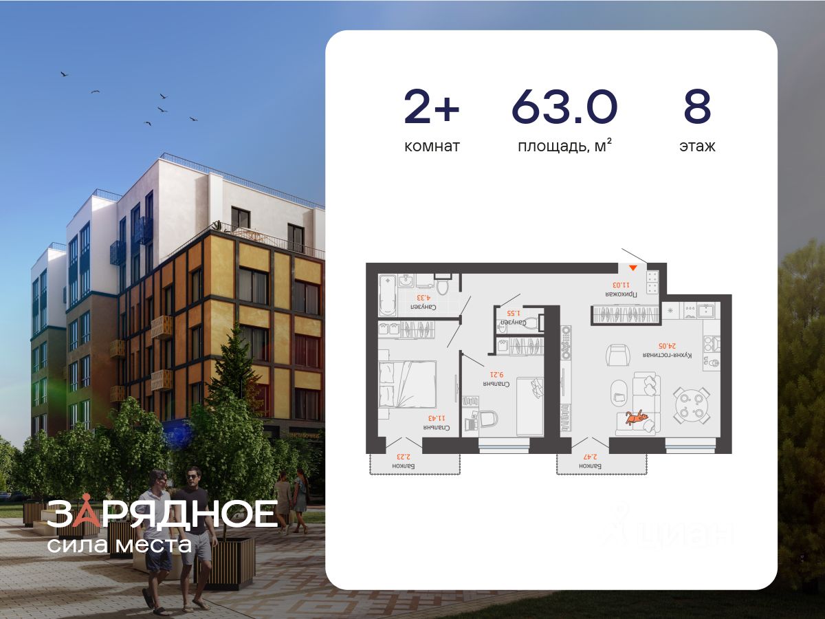 Продается 2-комнатная квартира, корпус 4/2, площадь 63.00 кв. Квартира находится в жилом комплексе комфорт-класса "Зарядное" (ГК "Железно").