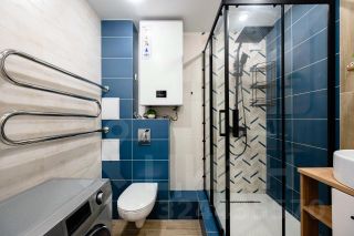 - санузел в керамической плитке, душ, установлены подвесная раковина с тумбой,