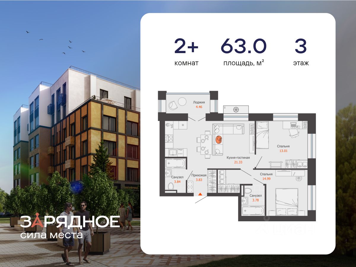 Продается 2-комнатная квартира, корпус 4/1, площадь 63.00 кв. Квартира находится в жилом комплексе комфорт-класса "Зарядное" (ГК "Железно").