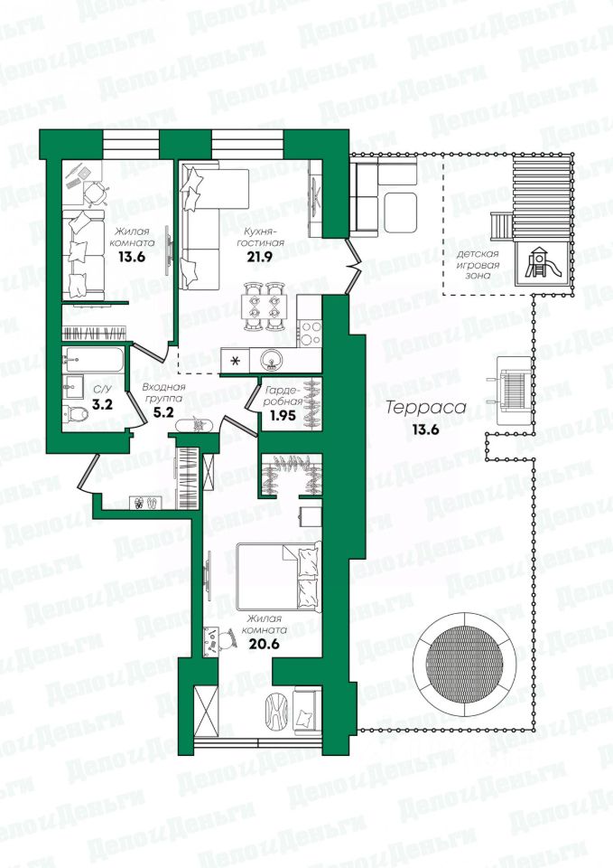 - детскую площадью 13,6 м² с оборудованной гардеробной