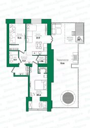 - взрослую спальню площадью 20,6 м² также с оборудованной гардеробной.