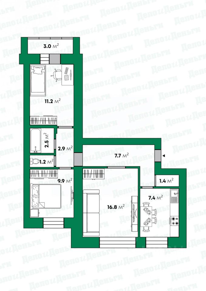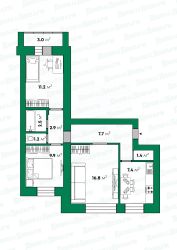 - жилые комнаты площадью 9,9 и 11,2 и 16,8 кв.м.