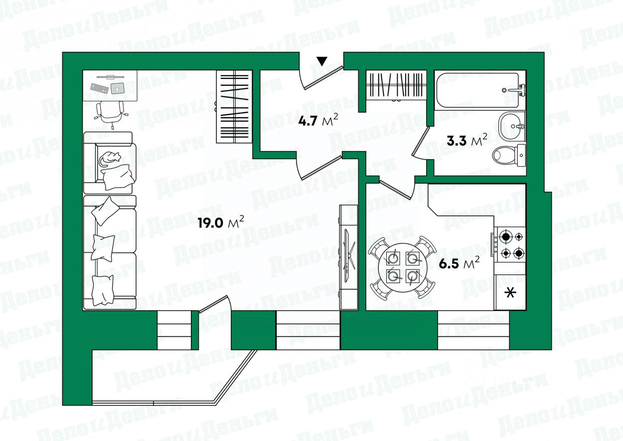 • Санузел (3.3 м²): Максимум функциональности! Ванна, унитаз, стиральная машина и водонагреватель уместились благодаря грамотному размещению.
