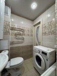 • Санузел выложен керамической плиткой. Установлены приборы учёта. Новые трубы и сантехника. Есть выводы под стиральную машинку.