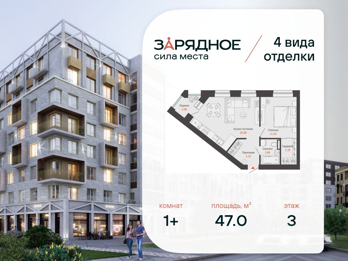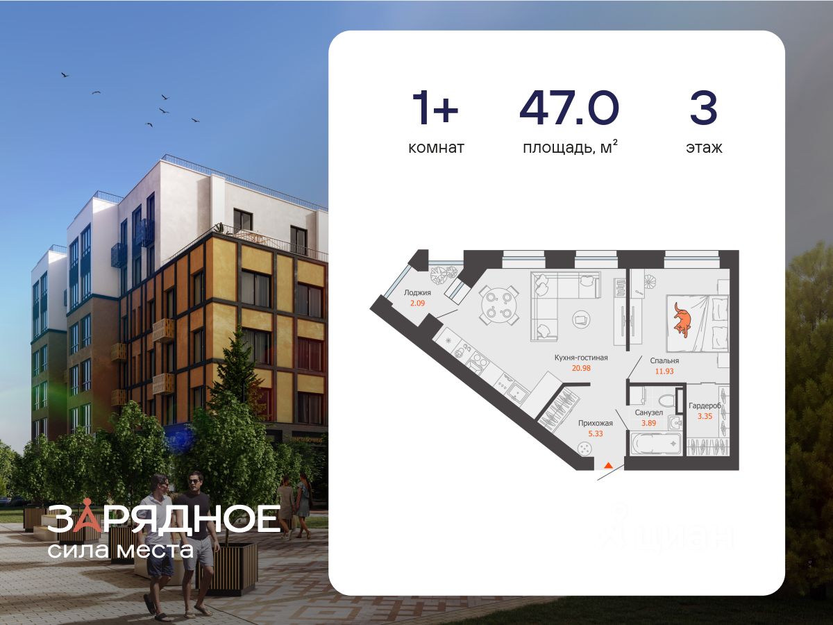Продается 1-комнатная квартира, корпус 4/2, площадь 47.00 кв. с предчистовой отделкой. Квартира находится в жилом комплексе комфорт-класса "Зарядное" (ГК "Железно").