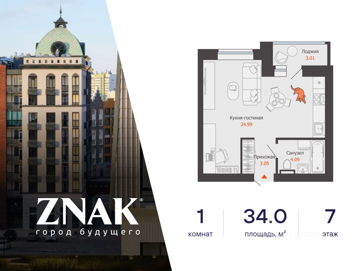Продается студия в 3 км от Зубаревского леса, площадью 34.00 кв. м. с предчистовой отделкой. Квартира находится в жилом комплексе комфорт-класса ZNAK от девелопера "Железно".