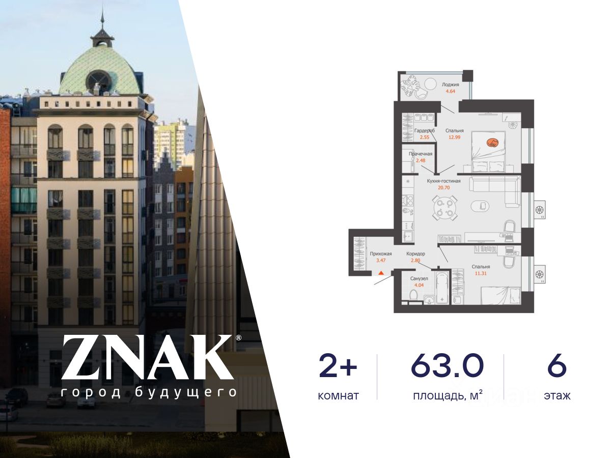 Продается 2-комнатная квартира в 3 км от Зубаревского леса, площадью 63.00 кв. м. Квартира находится в жилом комплексе комфорт-класса ZNAK от девелопера "Железно".