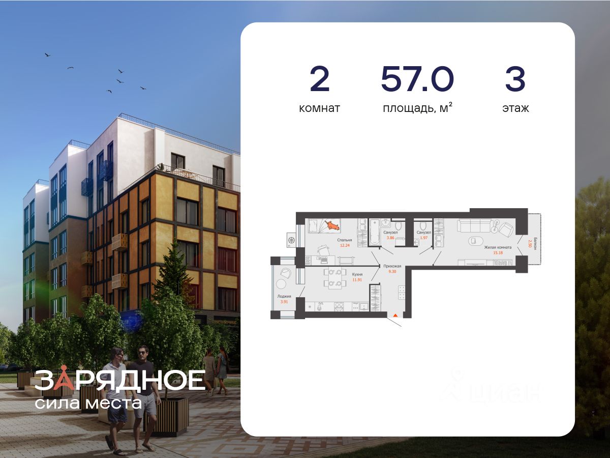 Продается 2-комнатная квартира, корпус 4/1, площадь 57.00 кв. Квартира находится в жилом комплексе комфорт-класса "Зарядное" (ГК "Железно").