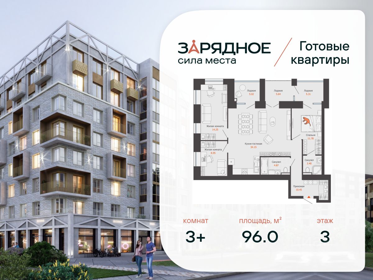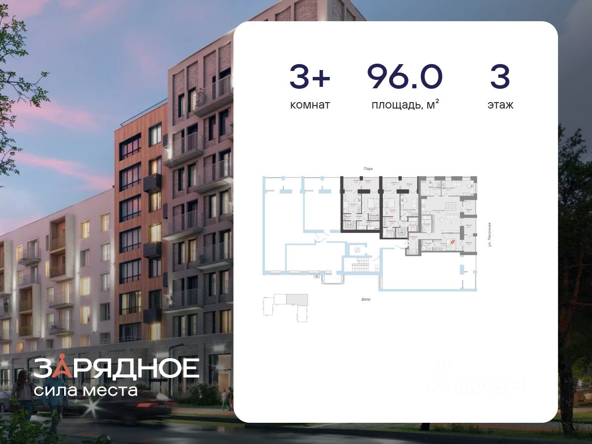 Продается 3-комнатная квартира, корпус 4/1, площадь 96.00 кв. Квартира находится в жилом комплексе комфорт-класса "Зарядное" (ГК "Железно").