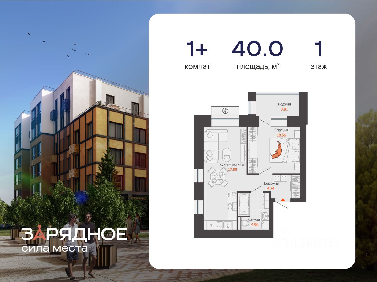 Продается 1-комнатная квартира, корпус 4/1, площадь 40.00 кв. Квартира находится в жилом комплексе комфорт-класса "Зарядное" (ГК "Железно").