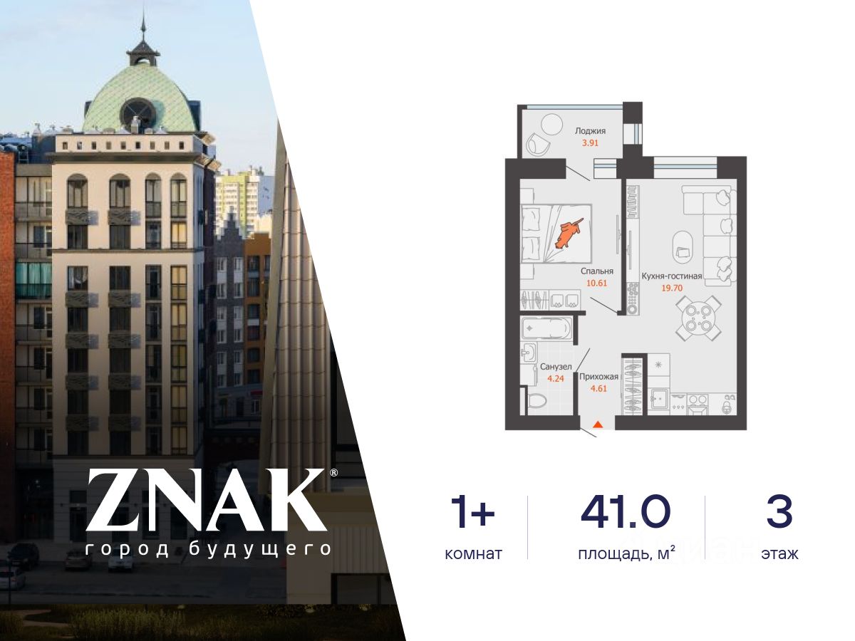 Продается 1-комнатная квартира в 3 км от Зубаревского леса, площадью 41.00 кв. м. Квартира находится в жилом комплексе комфорт-класса ZNAK от девелопера "Железно".