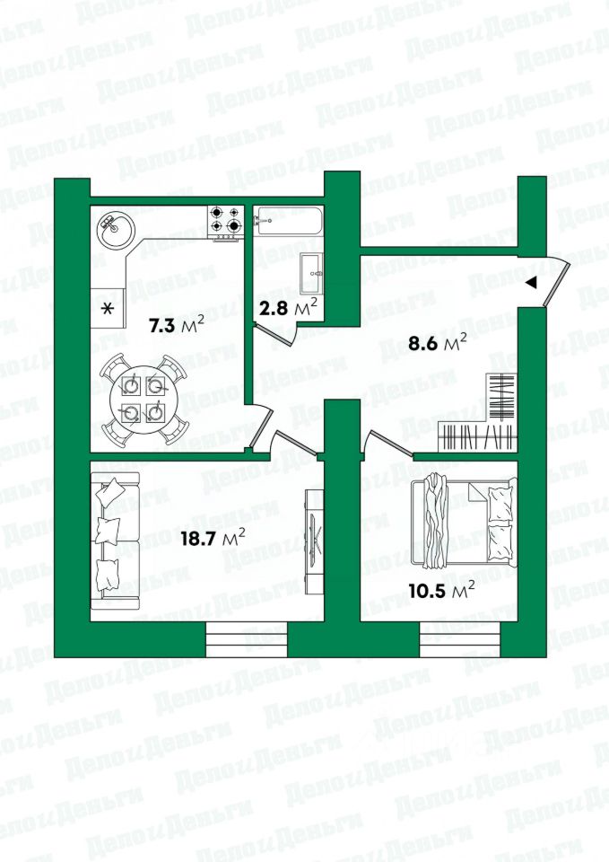 две отдельные комнаты (12,4 м², 10,5 м²) — родителям и детям по своему пространству