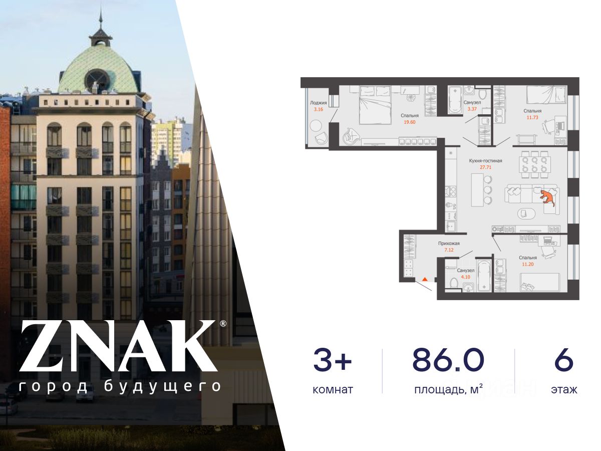 Продается 3-комнатная квартира в 3 км от Зубаревского леса, площадью 86.00 кв. м. Квартира находится в жилом комплексе комфорт-класса ZNAK от девелопера "Железно".