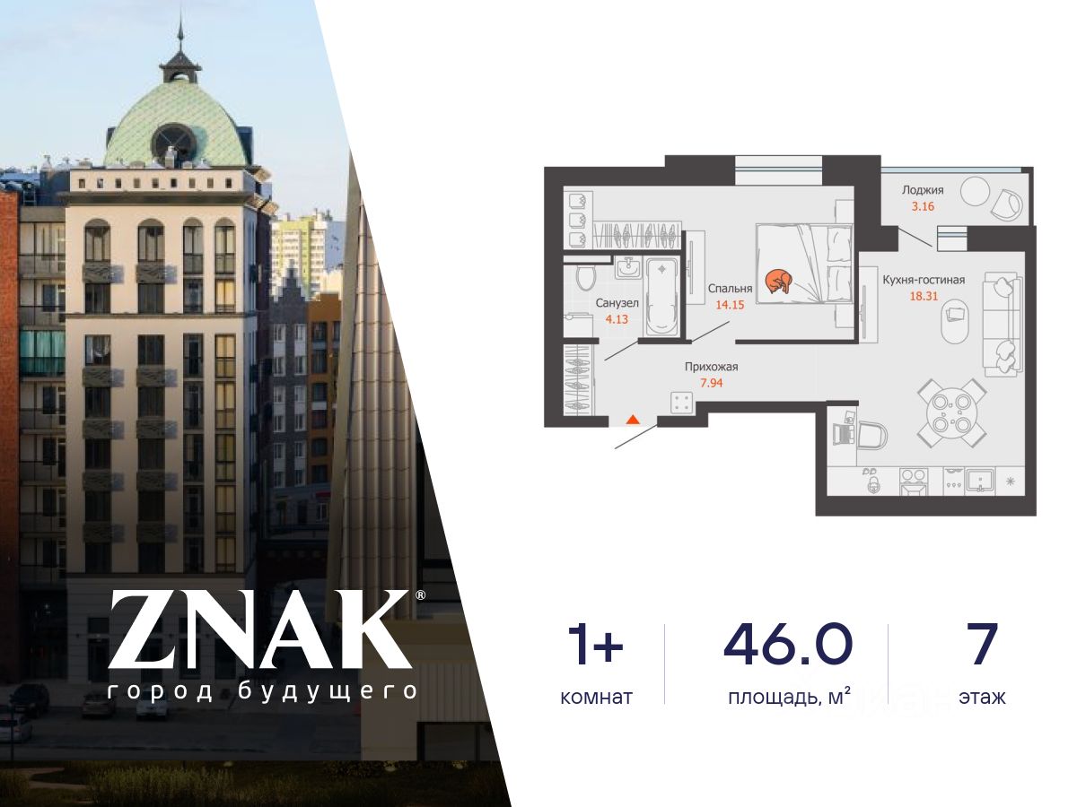 Продается 1-комнатная квартира в 3 км от Зубаревского леса, площадью 46.00 кв. м. Квартира находится в жилом комплексе комфорт-класса ZNAK от девелопера "Железно".