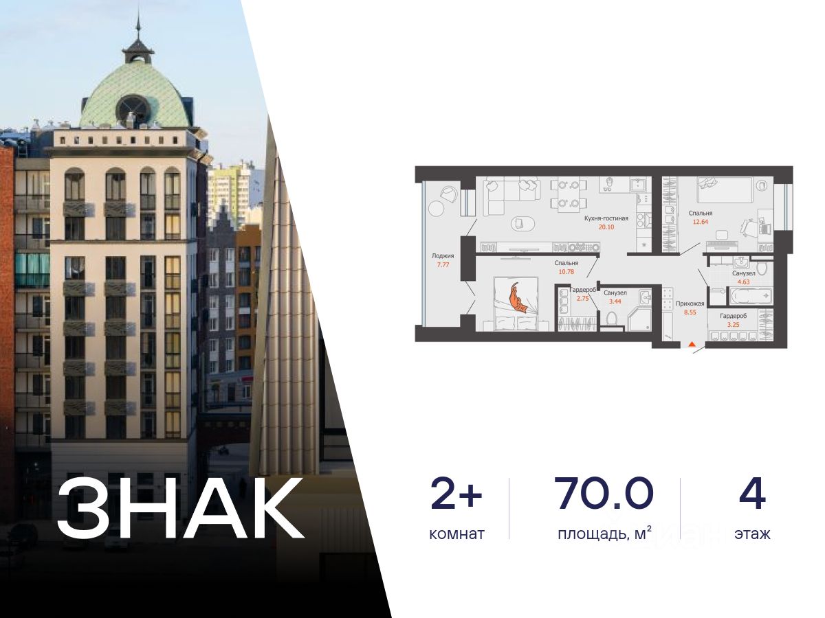 Продается 2-комнатная квартира в 3 км от Зубаревского леса, площадью 70.00 кв. м. Квартира находится в жилом комплексе комфорт-класса ЗНАК от девелопера "Железно".