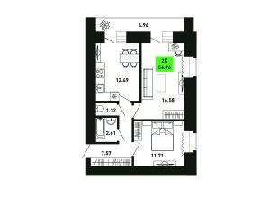 Продается 2-комнатная квартира на 2 этаже, площадью 54.76 квадратных метра. Сдача дома - 2 квартал 2027 года.