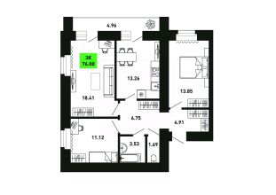 Продается 3-комнатная квартира на 15 этаже, площадью 76 квадратных метра. Сдача дома - 2 квартал 2027 года.