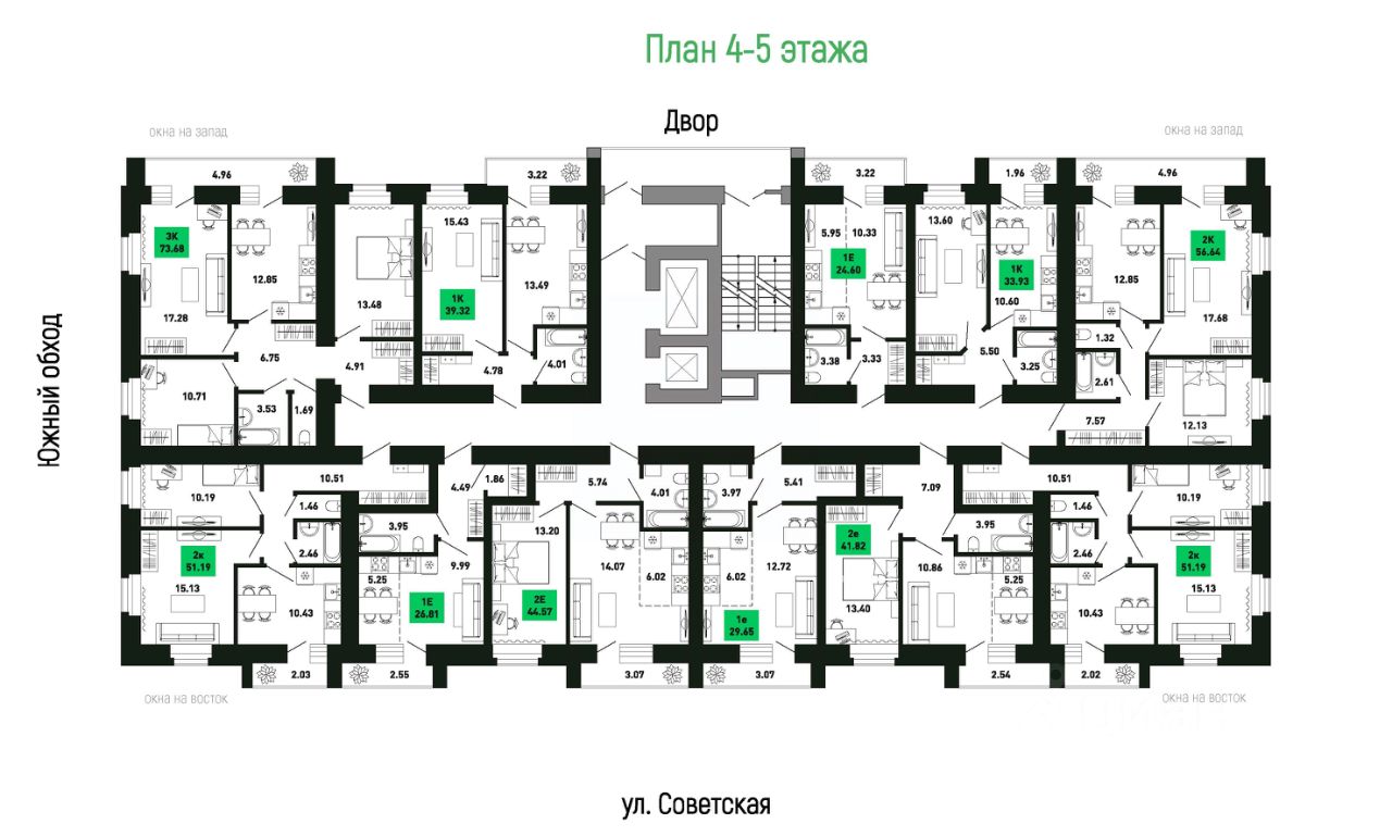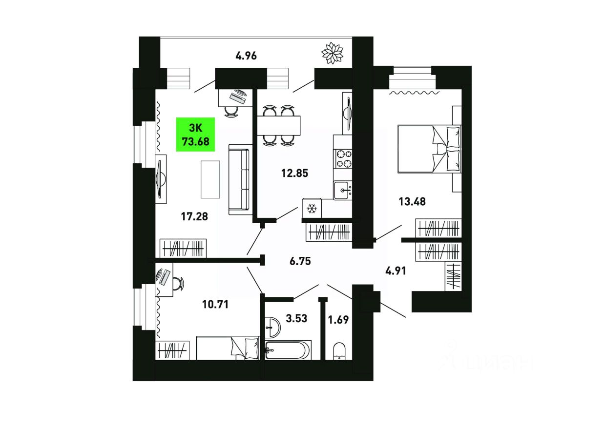 Продается 3-комнатная квартира на 5 этаже, площадью 73.68 квадратных метра. Сдача дома - 2 квартал 2027 года.