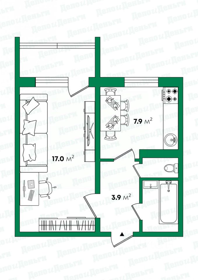 ПЛАНИРОВКА КВАРТИРЫ 34,1 кв. м ПРЕДУСМАТРИВАЕТ:
