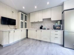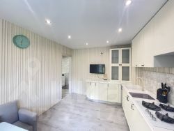 ** Общая площадь: 70,4 кв.м. и плюс лоджия: 4 кв.м., комнаты: 17 кв.м., 12 кв.м. и 11 кв.м. (изолированы), большая кухня: 12,6 кв.м. Санузел раздельный. Лоджия (остекление пластиковый стеклопакет). Окна (ПВХ) выходят на разные стороны дома (дополнительное проветривание и освещение). Большая прихожая: 12,3 кв.м. В квартире выполнен косметический ремонт: натяжные потолки, пол - ламинат. Установлены новые межкомнатные и входная двери. Кухня оборудована новым гарнитуром.