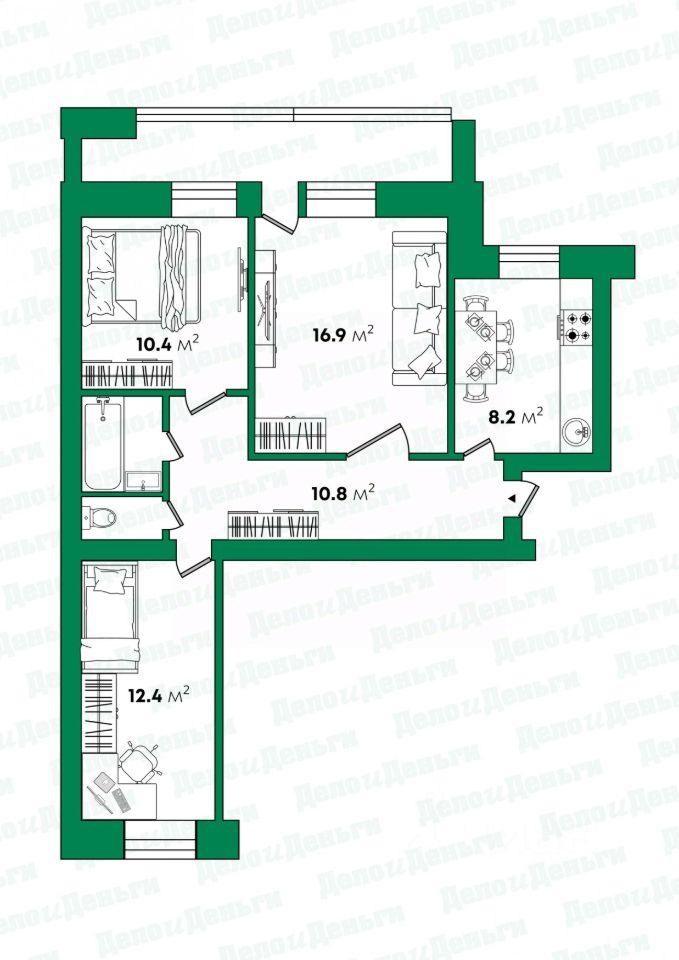 - жилые комнаты площадью 16.м, 12.4м, 10.4м.