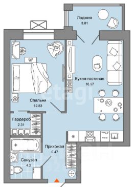 Помещения внутри квартиры правильной формы. В спальне широкое окно, выделена отдельная гардеробная комната.