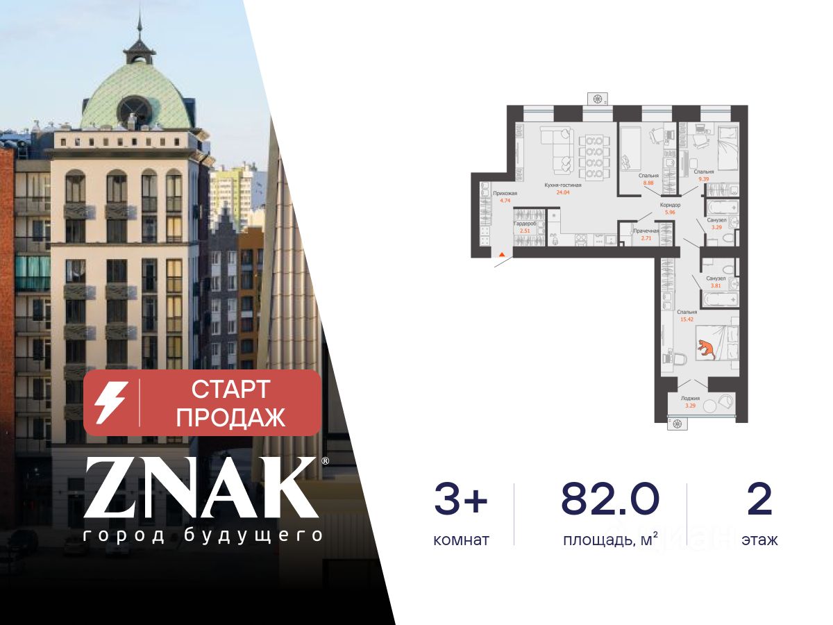 Продается 3-комнатная квартира в 3 км от Зубаревского леса, площадью 82.00 кв. м. Квартира находится в жилом комплексе комфорт-класса ZNAK от девелопера "Железно".