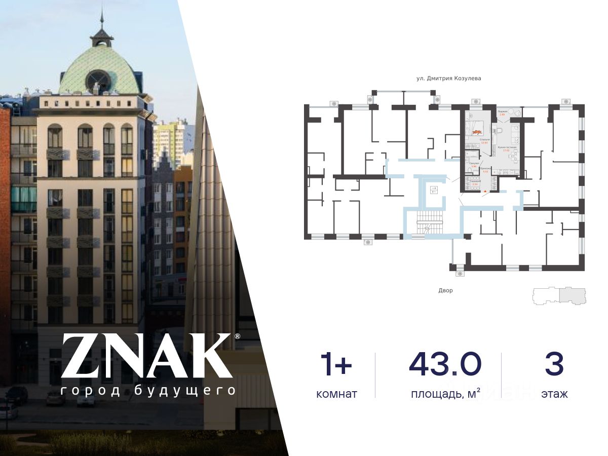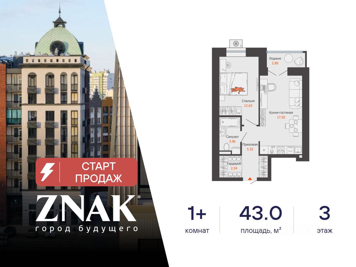 Продается 1-комнатная квартира в 3 км от Зубаревского леса, площадью 43.00 кв. м. Квартира находится в жилом комплексе комфорт-класса ZNAK от девелопера "Железно".