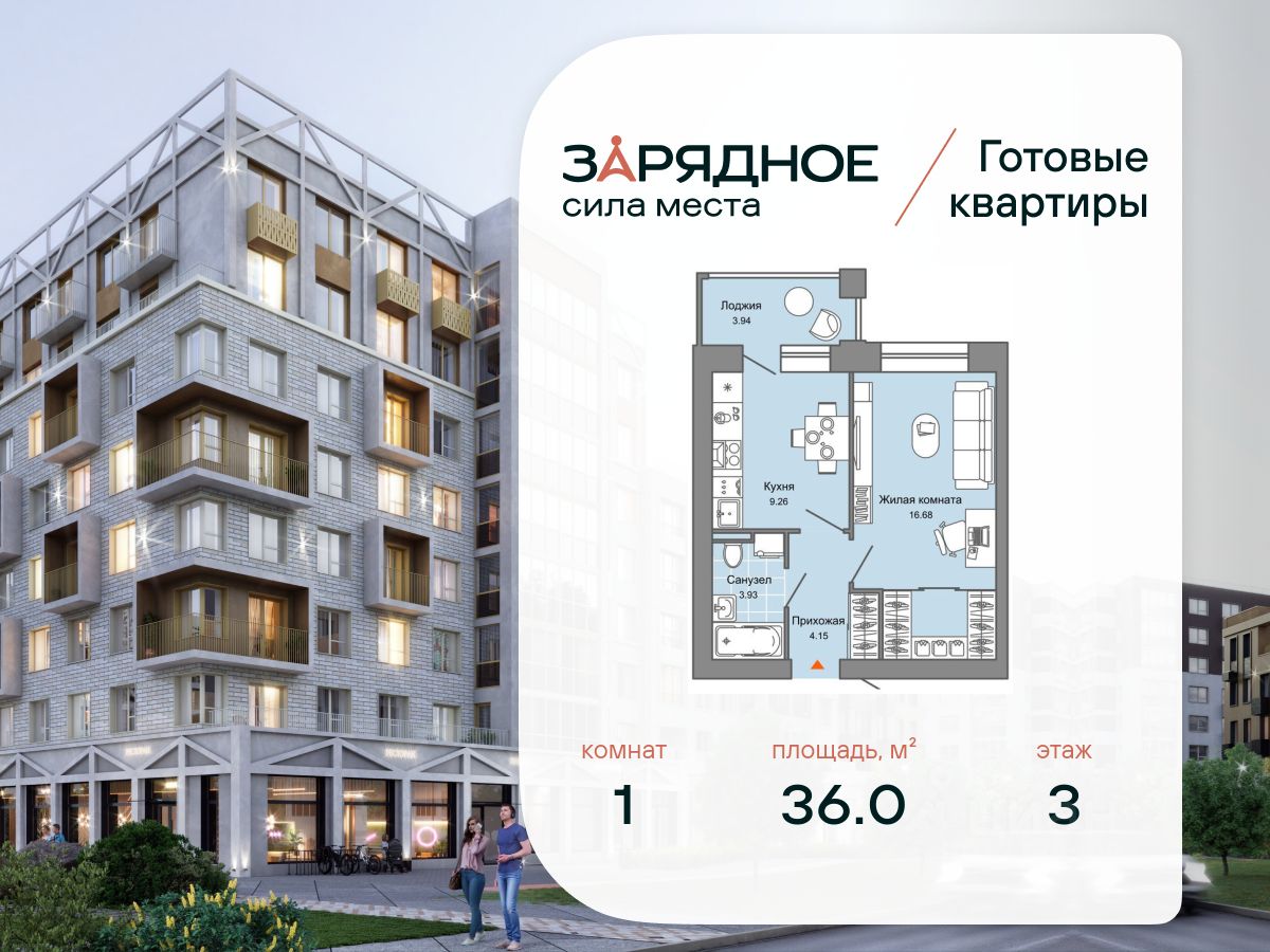 Продается 1-комнатная квартира, корпус 3, площадь 36.00 кв. Квартира находится в жилом комплексе комфорт-класса "Зарядное" (ГК "Железно").