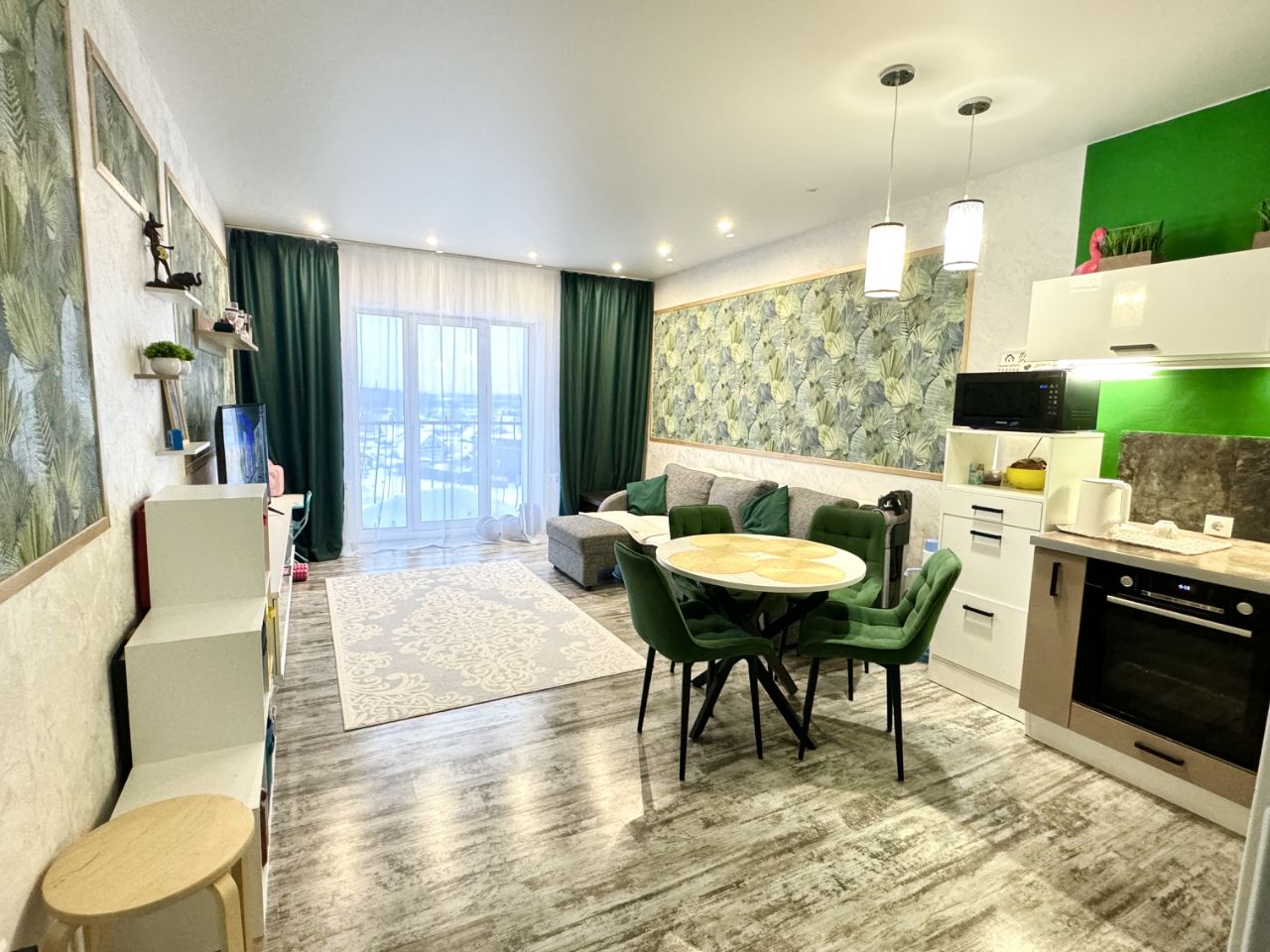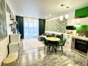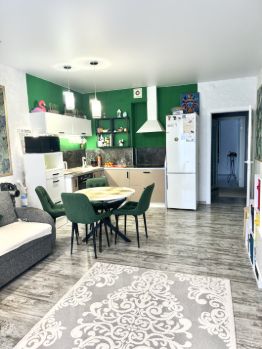 Кухня современная, с зелеными акцентами и стильной мебелью. В квартире изолированные комнаты, что обеспечивает комфорт и приватность. Большой санузел, раздельный, выполнен в современном стиле с качественной отделкой.