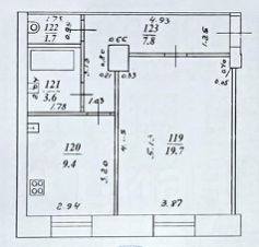 Кухня - 9,4 кв.м. Комната 19,7 кв.м. В квартире сделан косметический ремонт. Пол - ламинат . Окна выходят на улицу.