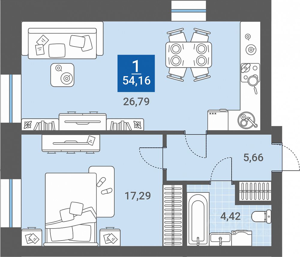 Продаётся 1-комнатная квартира в строящемся доме (дом 5), срок сдачи: IV-кв. 2026, общей площадью 54.16 кв.м., на 1 этаже. Новый жилой комплекс от застройщика "Гипромстрой" расположен по адресу: Россия, Киров, слобода Лосево, 5