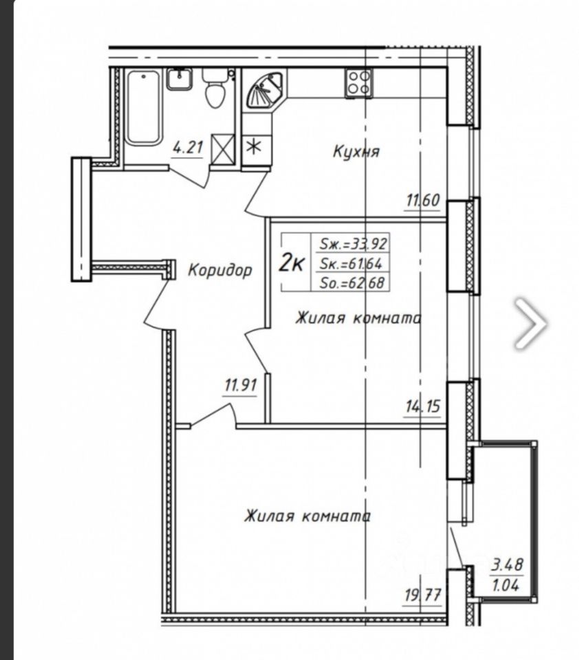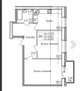 Площадь квартиры - 60 кв.м. - жилые комнаты площадью 19,77 кв.м и 14,5 кв.м. - просторная кухня 11,6 кв.м - прихожая с гардеробной 11,9 кв.м, совмещенный санузел, застекленная панорамная лоджия.