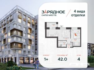 Продается 1-комнатная квартира, корпус 4/1, площадь 42.00 кв. Квартира находится в жилом комплексе комфорт-класса "Зарядное" (ГК "Железно").