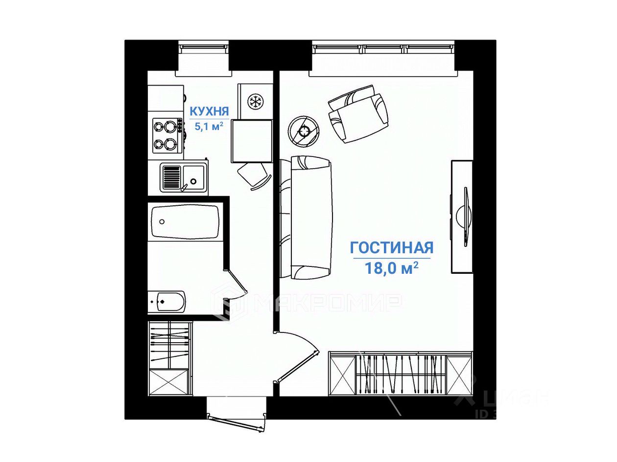 Комната 18 м² - правильной формы: можно разделить на зону отдыха и рабочее место. Шкаф-купе в прихожей: место для хранения уже предусмотрено.