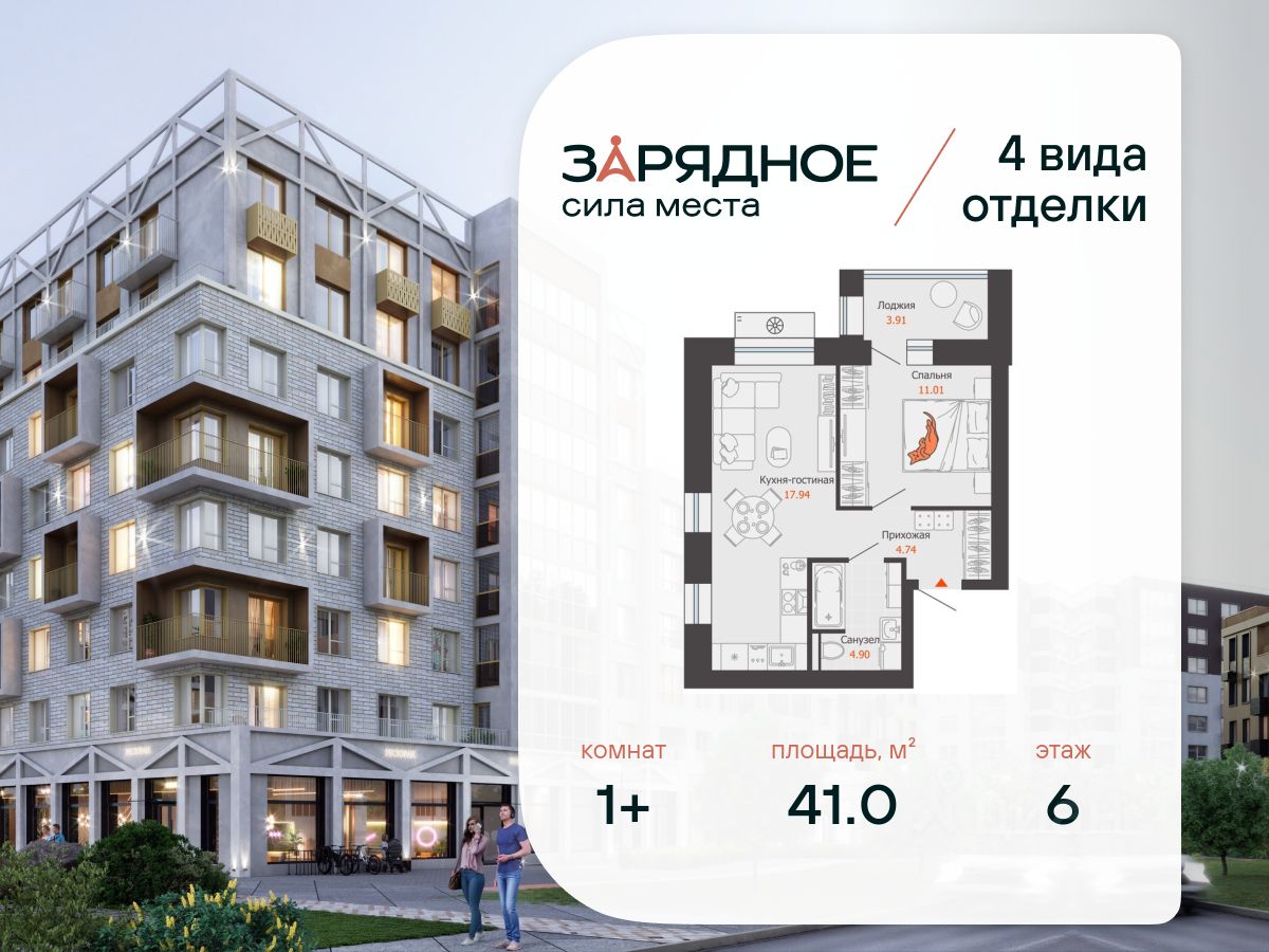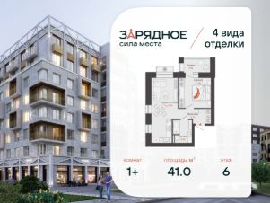 Продается 1-комнатная квартира, корпус 4/1, площадь 41.00 кв. Квартира находится в жилом комплексе комфорт-класса "Зарядное" (ГК "Железно").